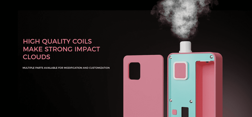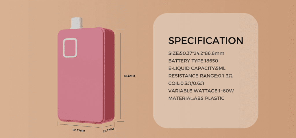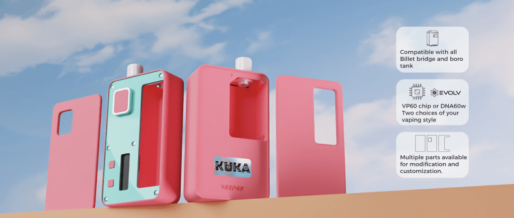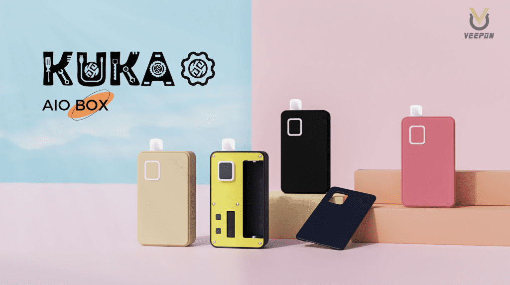 Veepon Kuka AIO Pro Box Mod ออกแบบรูปทรงกล่อง ใช้วัสดุเป็นABS Plastic อย่างดี ทำให้ตัวเครื่องมีน้ำหนักเบาและมีความทนทานสูง มีขนาดอยู่ที่ 86.6mm x 24.2mm x 50.37mm มีหน้าจอ TFT สำหรับบอกสถานะแบตเตอรี่และการปรับวัตต์ อยู่ติดกับตัวเครื่อง ต้องเปิดฝาออกถึงสามารถมองเห็นได้