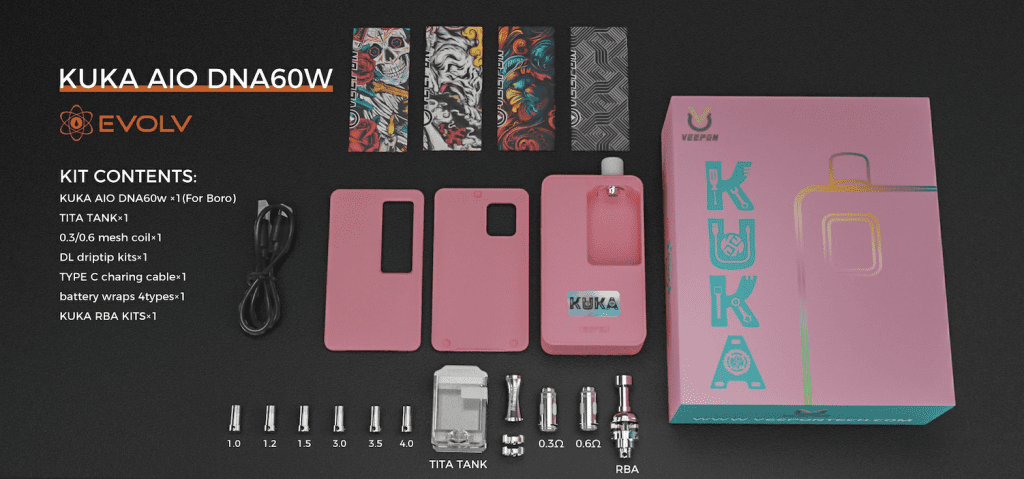 พอต Veepon Kuka AIO DNA60w Box Mod ตัวใหม่มาแรง จากค่าย Veepon ที่ปรับวัตต์ได้แบบสะใจ และที่สำคัญภายในยังเป็น Chipset รุ่น VP60 ของVeepon เองด้วย ตัวเครื่องสามารถปรับไฟได้ตั้งแต่ 1-60 watt และยังมีฟังค์ชั่นสำหรับล๊อกปุ่ม Veepon Kuka AIO Pro Box Mod ใช้งานได้ทั้งสองแบบ ไม่ว่าจะเป็น Coil สำเร็จจากโรงงานหรือ โมคอยล์ด้วยตัวเอง ทำให้เราได้สนุกแน่นอนกับการโมลวด และปรับแต่งตามใจ ตัวเครื่องมีรูลมมาให้ข้างๆเครื่อง ตัวเครื่องมี Tank Boro รุ่น Veepon Tita Empty Tank ขนาด 5ml มากับตัวเครื่องอีกด้วย