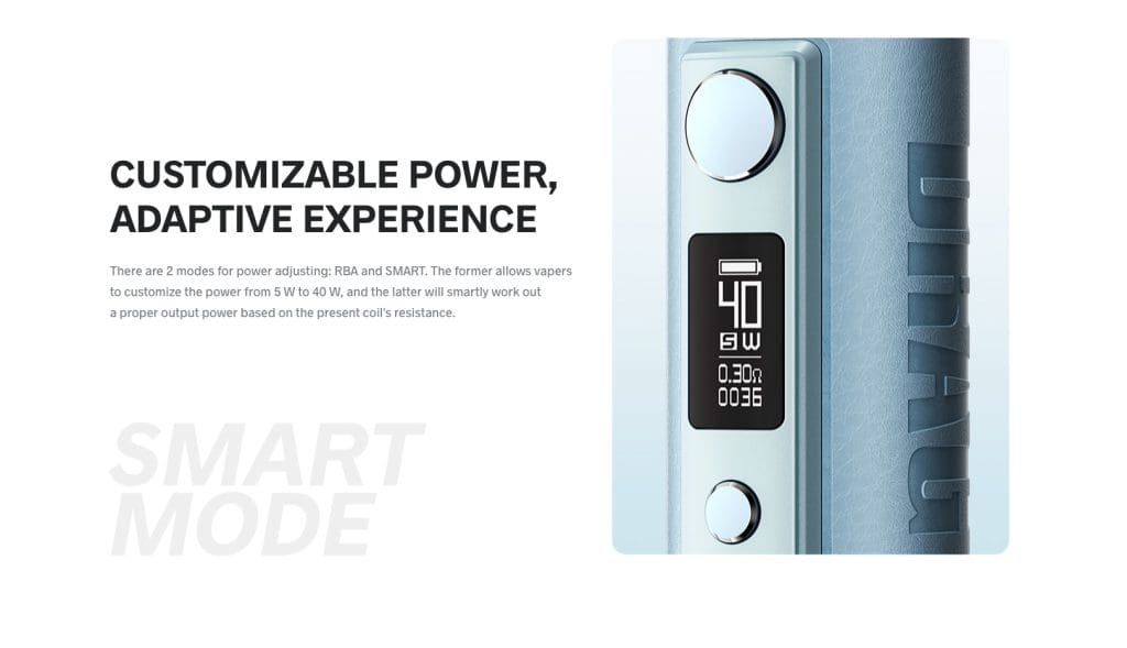 • ปรับกำลังไฟได้ 2 โหมด คือ RBA ช่วยให้เรื่องการปรับกำลังไฟได้ตั้งแต่ 5W ถึง 40W และโหมด SMART จะทำงานโดยใช้ watt ที่เหมาะสมตามคอยล์ที่เราใช้