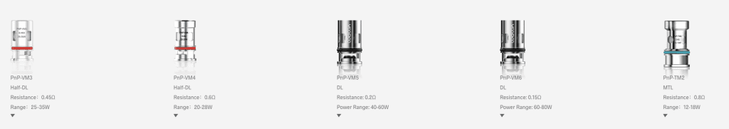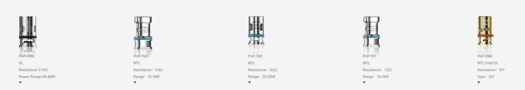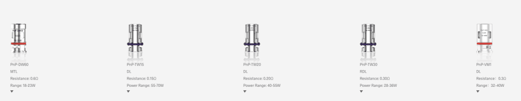 มีคอยล์ให้เลือกใช้ได้หลายรุ่น ในตระกูล PnP ได้แก่ PnP-DW60(0.6Ω) / VOOPOO PnP-TW15 (0.15Ω) / คอยล์ VOOPOO PnP-TW20 (0.2Ω) / VOOPOO PnP-TW30 (0.3Ω) / VOOPOO PnP-VM1 (0.3Ω) / คอยล์ VOOPOO PnP-VM3 (0.45Ω) /คอยล์ VOOPOO PnP-VM4 (0.6Ω) / คอยล์ VOOPOO PnP-VM5 (0.2Ω) / คอยล์ VOOPOO PnP-VM6 (0.15Ω) คอยล์ VOOPOO PnP-TM2 (0.8Ω) / คอยล์ VOOPOO PnP-TM1 (0.6Ω) / คอยล์ VOOPOO PnP-TR1 (1.2Ω) / คอยล์ VOOPOO PnP-RBA