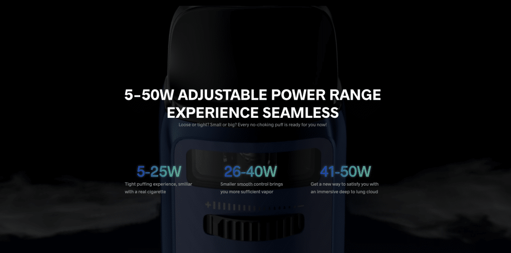 ตัวเครื่องสามารถปรับตั้งค่าการจ่ายไฟที่แม่นยำตามกำลังวัตต์ สามารถกำหนดวิธีการสูบของผู้ใช้ได้อย่างง่ายดาย โดยสามารถปรับได้แบ่งเป็น 3 ช่วง 5-25w ให้ฟิลการสูบที่ใกล้เคียงกับบุหรี่มวน 26-40w ให้ฟิลการสูบที่สมูทมากขึ้น และได้รสชาติและกลิ่นที่ชัดเจน 41-50w ให้ฟิลการสูบแบบควันเยอะๆ และดึงควันได้ลึกๆสุด